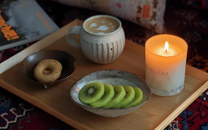 Place a candle with calming notes—chamomile, lavender, or sandalwood—on your nightstand. Light it an hour before sleep as part of your wind-down ritual. It sets a peaceful mood, gently signaling the body that it’s time to let go of the day. (Always remember to blow it out before sleeping!)